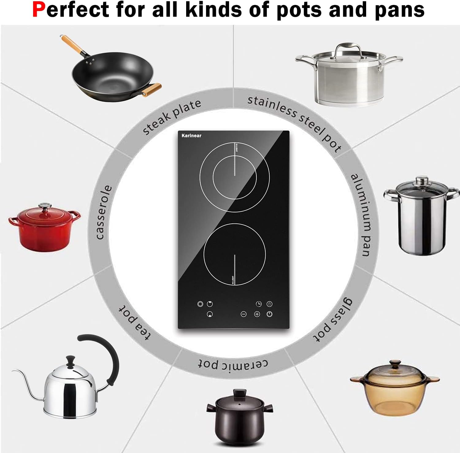 - 【Compatible with Any Flat-bottomed Kitchenware】Karinear built in ceramic hob is very convenient that is suitable for all types of cookware, such as aluminium pans, stainless steel pans, ceramic pans, glass pot, copper pans, cast iron frying pans and so on. Please install the electric radiant cooktop according to the product manual and contact us at any time.