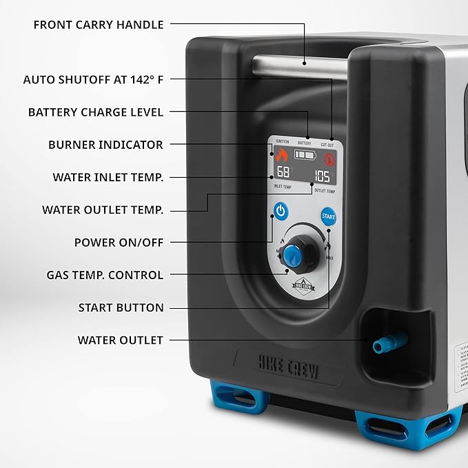 Hike Crew Portable Propane Water Heater & Shower Pump w/Built-in Battery | Compact Outdoor Cleaning & Showering System w/LCD, Safety Shutoff & Carry Case, Instant Hot Water for Camping & Hiking
