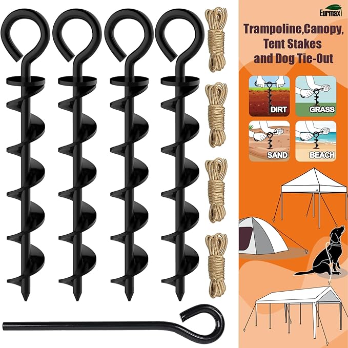 Eurmax USA Canopy Tent Stakes Dog Tie Out Stakes Corkscrew Shape Steel Trampoline Stakes with Iron Rod Installation Tool & 4 Wind Ropes - Set of 4 (Black)