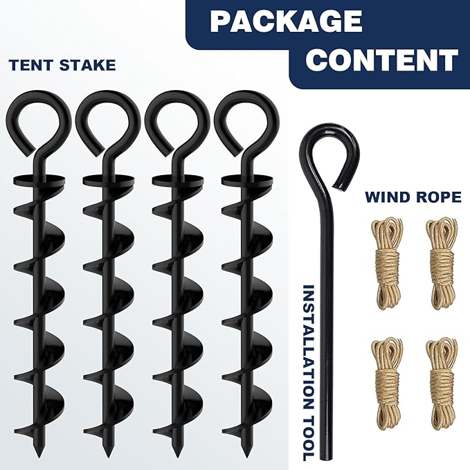 - Package includeds: 4 stakes, 4 flat ropes and an installation tool. With this package, you get a complete tent anchoring solution,everything is included.