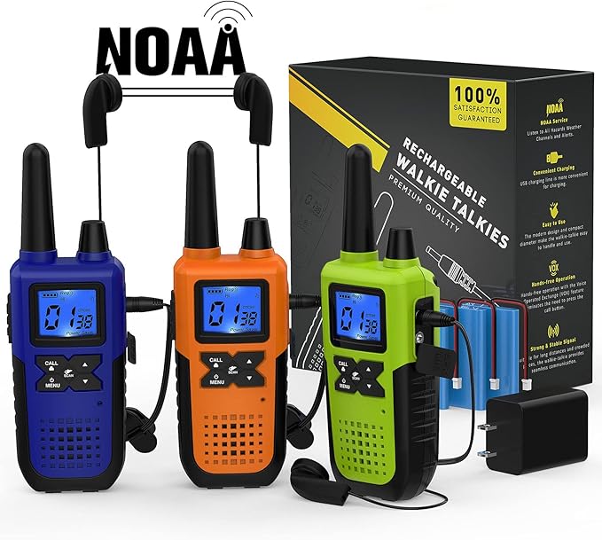 3 Long Range Walkie Talkies Rechargeable for Adults - NOAA 2 Way Radios Walkie Talkies 3 Pack - Long Distance Walkie-Talkies with Earpiece and Mic Set Headset USB Charger Battery Weather Alert