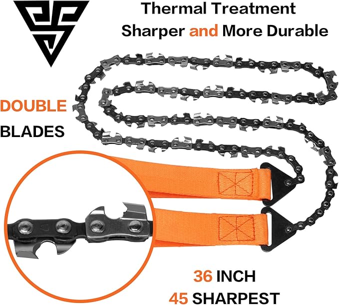 - ✔SUPERIOR 36 INCH BI-DIRECTIONAL & SELF-CLEANING CHAINSAW! RIPS THROUGH THICK TREE LIMBS LIKE BUTTER! This gear is extremely lightweight, versatile, flexible, and compact – able to cut a 3" limb in less than 10 seconds! Made of high-strength, super-strong heat-treated steel.This 45 teeth pocket chainsaw is 36 inches long with sharp teeth on Double Blades, so that means the saw cuts 3 x faster than saws with teeth, and even thick tree limbs are no match for this compact but mighty hand chainsaw.