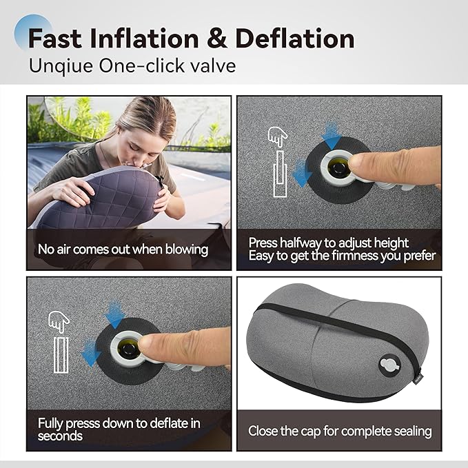 - Convenient Click Type One-Way Valve: Inlet valve has a spring loaded stopper that self seals as you inflate. Click the button to blow and air it up to the fullest in only 3-5 breaths, click again to quickly deflate in seconds. Slightly hold on the button to slowly release air to your desired firmness or softness, easy to adjust the comfort.