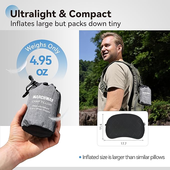 - Ultralight and Compact: This inflatable backpacking pillow weighs only 4.95 ounces. The size is adequately large to well support your head and neck when inflated, while packs down into included soda can sized storage bag when deflated, easy to put in your backpack or even in pocket, perfect for camper, hiker, backpacker and traveler.