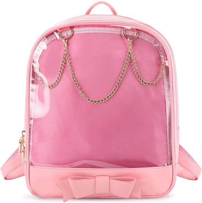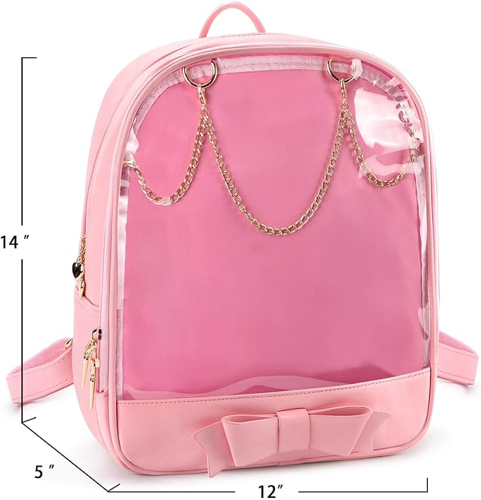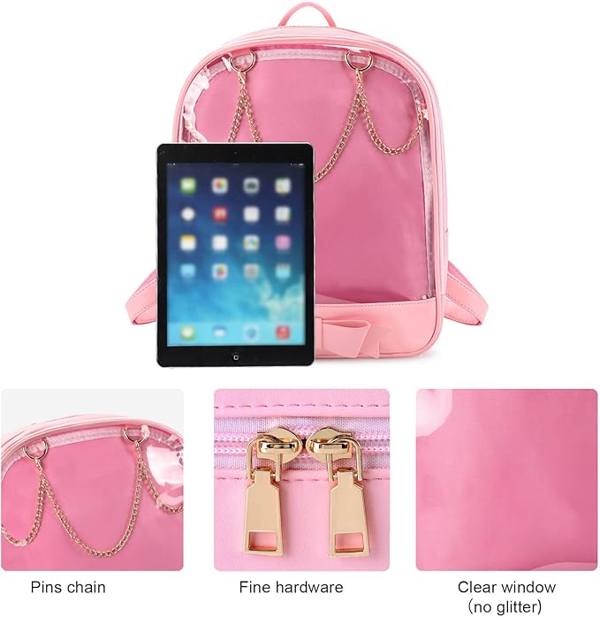 • ❤Structure❤:The ita backpack have a transparent window with glitter.It also have chains and two hooks,you can hang anime stufss on it.One main pocket for some books or ipad.Two inside pocket and a key ring for keys or coins.