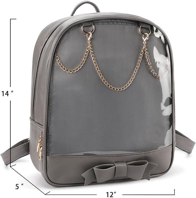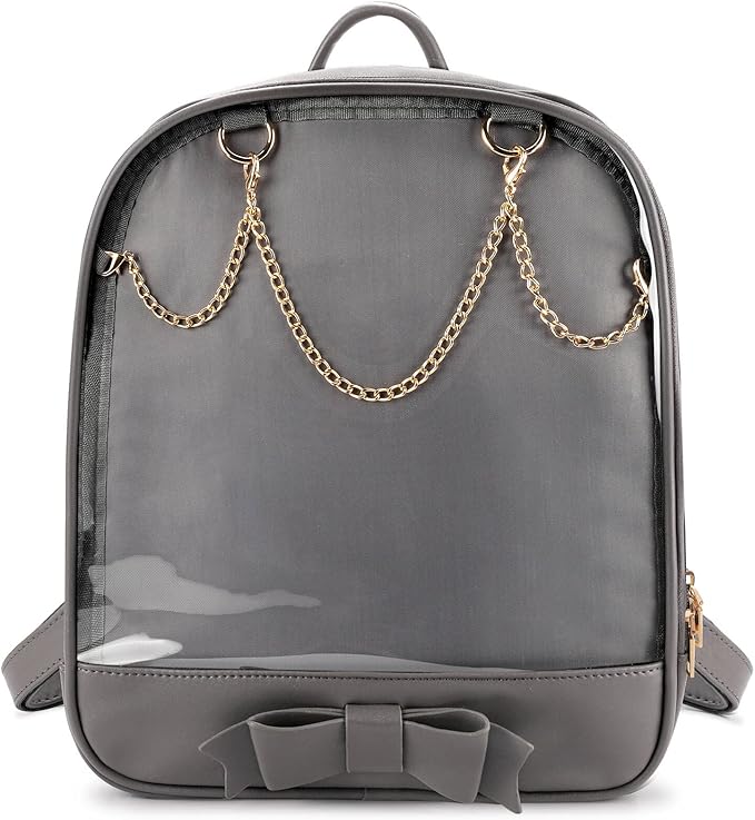 - ❤Structure❤:The ita backpack have a transparent window with glitter.It also have chains and two hooks,you can hang anime stufss on it.One main pocket for some books or ipad.Two inside pocket and a key ring for keys or coins.