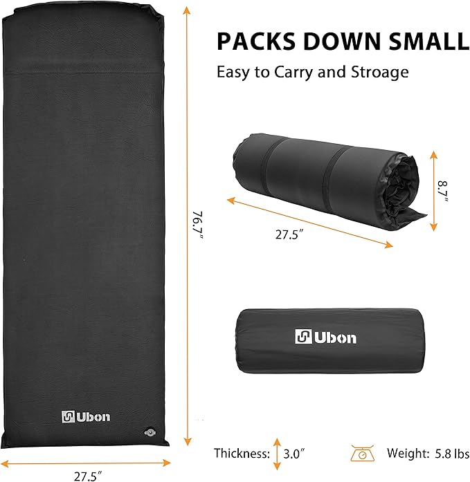 Ubon Sleeping Foam for One Person Fast Self Inflating Camping Pad 3 Inch Extra Thickness Camping Foam Pad Thick Inflatable Moisture-Proof Foam - Black