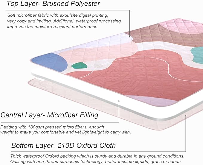 - Three Layers: Made of multi layers materials with ultra sonic quilting technology. Soft brushed fabric on the top, padding with pressed microfibers, and sturdy 210D oxford cloth as backing. Both the top and bottom are processed with waterproof finish,non thread sewing further improves the moisture performance, and better insulates grass or sands
