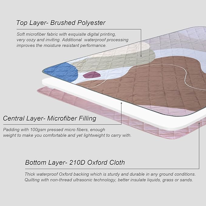 - THREE LAYERS: Made of multi-layers materials with ultra-sonic quilting technology. Soft brushed fabric on the top, padding with pressed microfibers, and sturdy 210D Oxford cloth as backing. Both the top and bottom are processed with waterproof finish,non-thread sewing further improves the moisture performance, and better insulates grass or sands. [Be Aware: No resistant to hot water!]