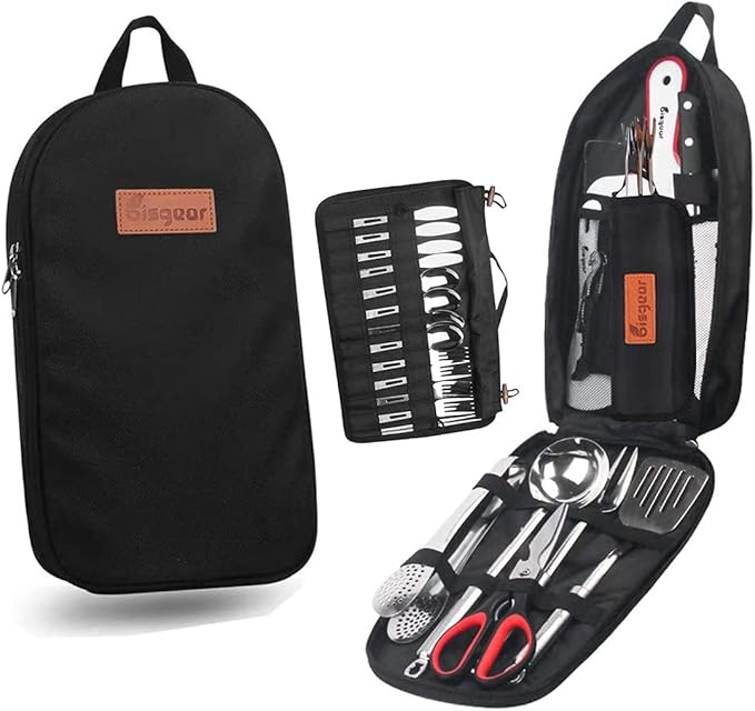 - MULTIPURPOSE: The trendy kit can be used for multiple applications, perfect for camping, sporting events, hiking, boat rides, mountaineering, BBQs, and more. The weather retardant travel utensil kit is the perfect camp kitchen accessory, and it holds all your essential outdoor cooking utensils.