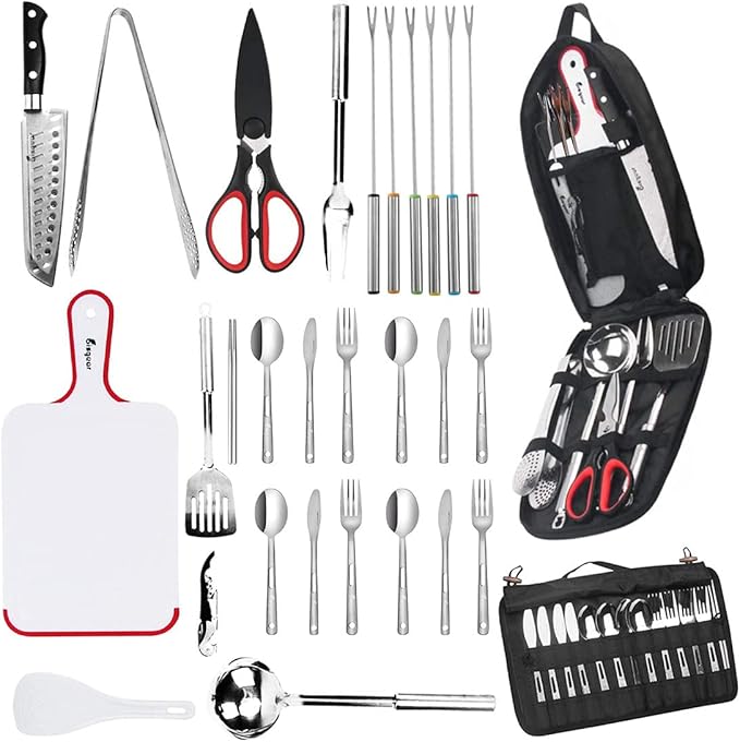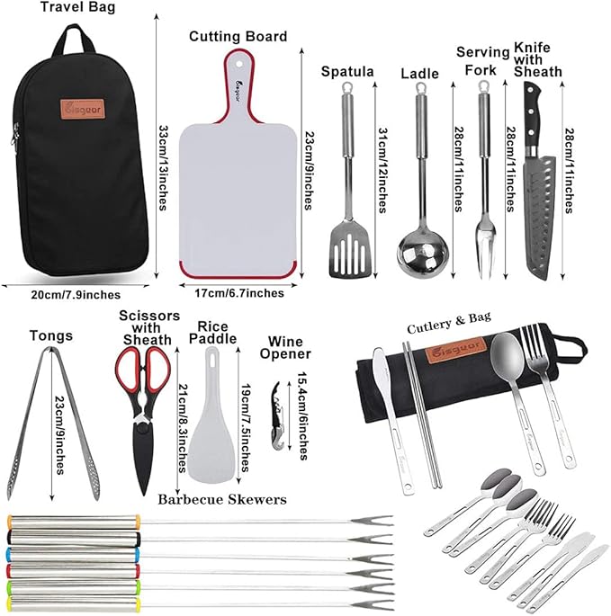 - UPGRADED COMPACT ORGANIZER: Neatly organizes and holds your utensils in one convenient place. Each utensil has its own designated pouch, so units don’t get smeared, scratched or damaged in storage or in transit. This 29PCs set includes: Serving Fork,Scissors with Sheath, Utility Knife with Sheath, Cutting Board, Spatula, Wine Opener, Tongs, Ladle, Rice Paddle,4pcs Fork, 4pcs Spoon, 4pcs Knife, Chopstick & 6pcs Barbecue Skewers.