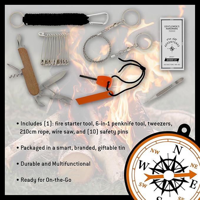 - THIS SURVIVAL KIT INCLUDES: (1) fire starter, (1) 6-in-1 pen knife (w/ a knife, scissors, corkscrew, (2) can openers, & a Phillips screwdriver), (1) pair of tweezers, (1) 82" woven rope, (1) wire saw, & (10) safety pins