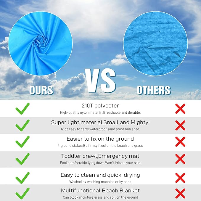 - 🏕️Beach Blanket Oversized:Good tear resistance,dry quickly.Also can be used as a rain shed,sunshade,tent,toddler crawl,emergency mat.Feel comfortable to lying down.Won't irritate your skin,better professional fabric sewing.