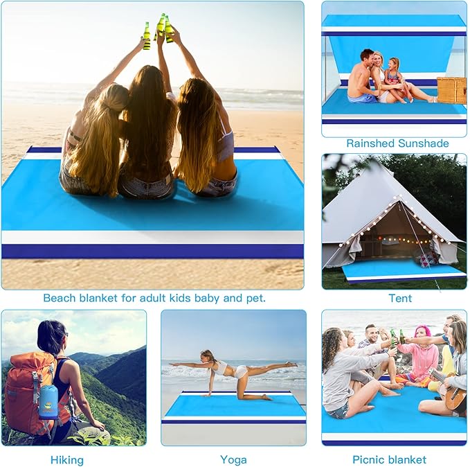 - 🏕️Beach Blanket Oversized:Good tear resistance,dry quickly.Also can be used as a rain shed,sunshade,tent,toddler crawl,emergency mat.Feel comfortable to lying down.Won't irritate your skin,better professional fabric sewing.