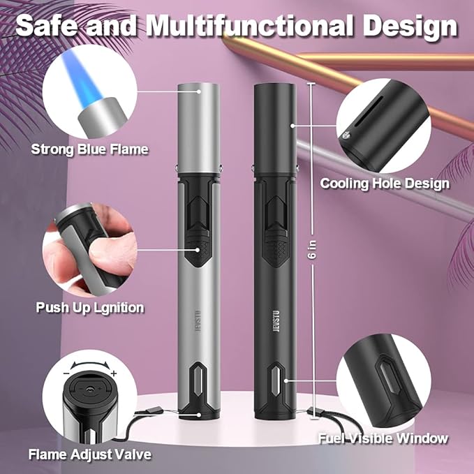 - 🔥【Butane Lighter & Safe Multipurpose 】- This torch lighters powerful torch jet flames can easily against any breeze, strong blue flame.Lightweight and easy to carry, just put in your pocket. The lighter is stored in a beautiful gift box, a unique gifts idea for Friend, Father’s Day, Birthday, Thanksgiving, Christmas etc. Our product comes with 5-Year Warranty, ATTENTION: This flame lighter contains no butane due to DOT and USPS Safety