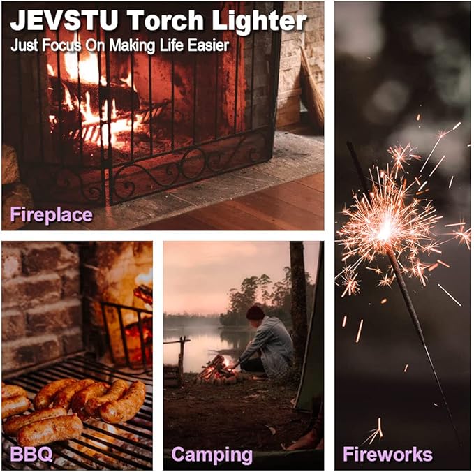 - 🔥【Jet Lighter & Windproof Adjustable Flame】JEVSTU butane lighter's flame regulating valve is located at the bottom of the lighter. After lifting the recessed handle, you can easily adjust the flame size without any tools. From weak to strong flame, it is very convenient. The torch jet flame is concentrated in the steady ceramic nozzle, Maximum temperature up to 2800°F, it can easily against outdoor wind.
