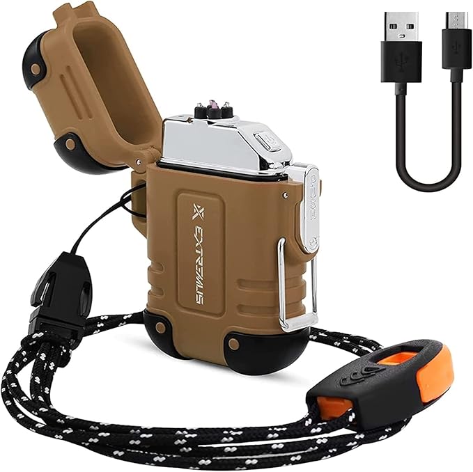 Extremus Blaze 360 Rechargeable Electric Lighters, Dual Arc Lighter, Windproof Plasma Lighter, Waterproof Flashlight Lighter, Flameless Lighter with Whistle Lanyard for Camping (Brown)