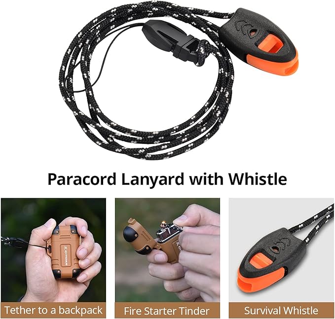 - Multi-Purpose Survival Lighter– This lightweight device includes a paracord lanyard with a whistle should unexpected survival situations arise. Use the flashlight modes to light up your surroundings or signal for help at night. Use the flame-less spark to safely light a candle, cigarette, or camp fire in any weather conditions.