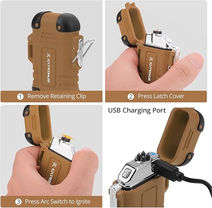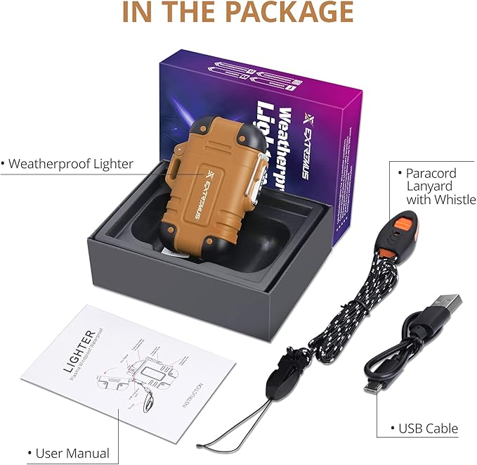 - Key Features of Electric Lighter–IP56 Dust-proof & Waterproof Lighter – Safe flameless Windproof Lighter– 3 mode flashlight camping lighter – Rechargeable lithium ion batteries – Survival whistle and lanyard Rechargeable Lighter– The Extremus tactical lighter is powered by a