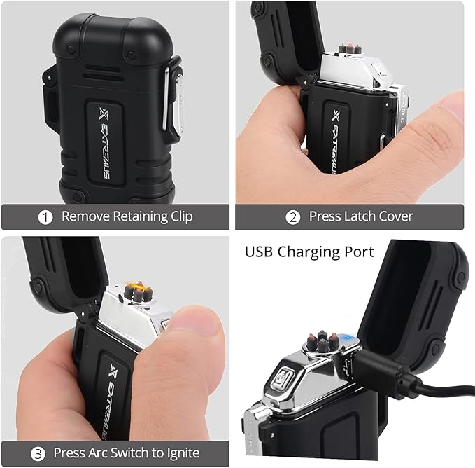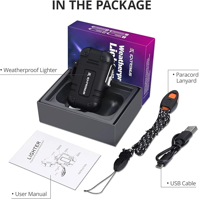 - IPX7 Waterproof Lighter-Extremus waterproof electric lighter can start a fire in the most severe weather conditions. The plasma arc windproof Lighter works well in rainy day and windy day, it is great for camping,travelling and hiking.