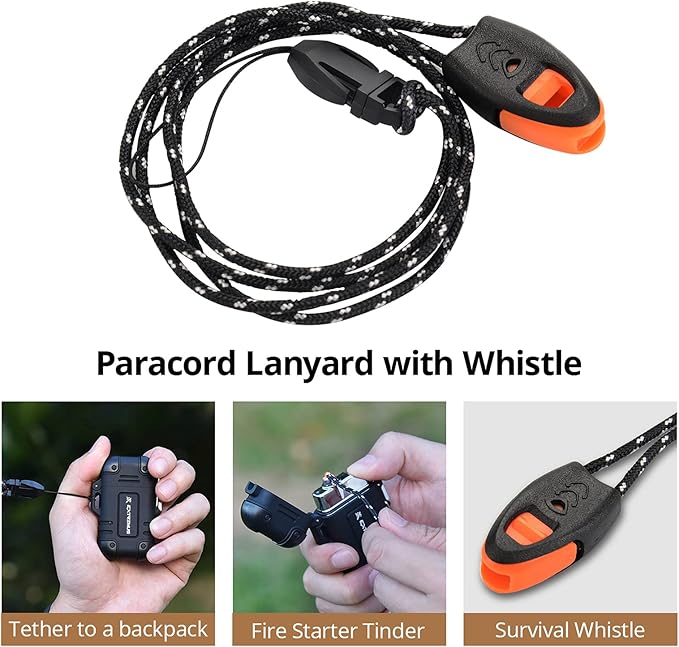 - Survival Lighter – The tactical lighter includes a paracord lanyard with a whistle should unexpected survival situations arise. The paracord material can be used as tinder to start a fire, create a fishing lure, make a survival bow, and more.