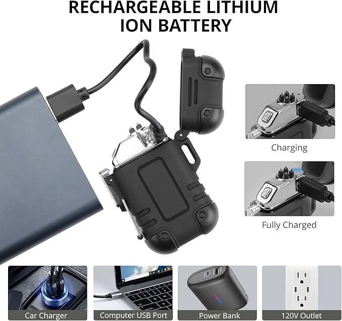 - USB Lighter – The windproof lighter is powered by a rechargeable lithium ion battery that can be used up to 300 times on a single charge. This quick charge battery will reach a full charge in only 1.5-2 hours and will stay charged for up to a week.