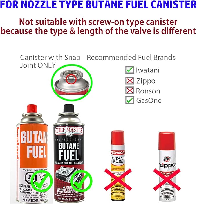 - Easy to connect to a nozzle type butane gas fuel canister.