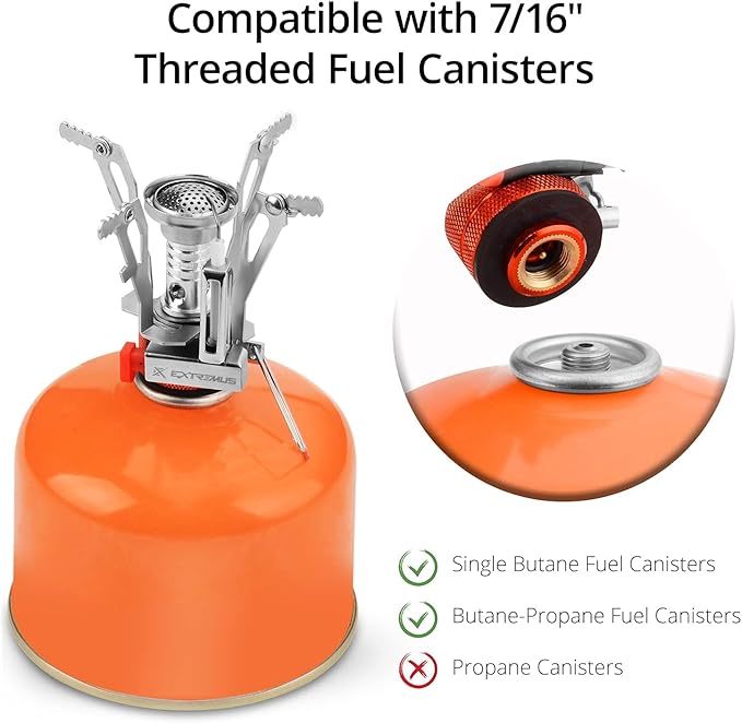 - FUEL – Use butane/butane-propane single fuel canisters to power your stove. The 7/16” threads are compatible with most standard canisters. Note the Extremus Portable Camp Stove does NOT fit onto standard propane canisters. Fuel is not included.