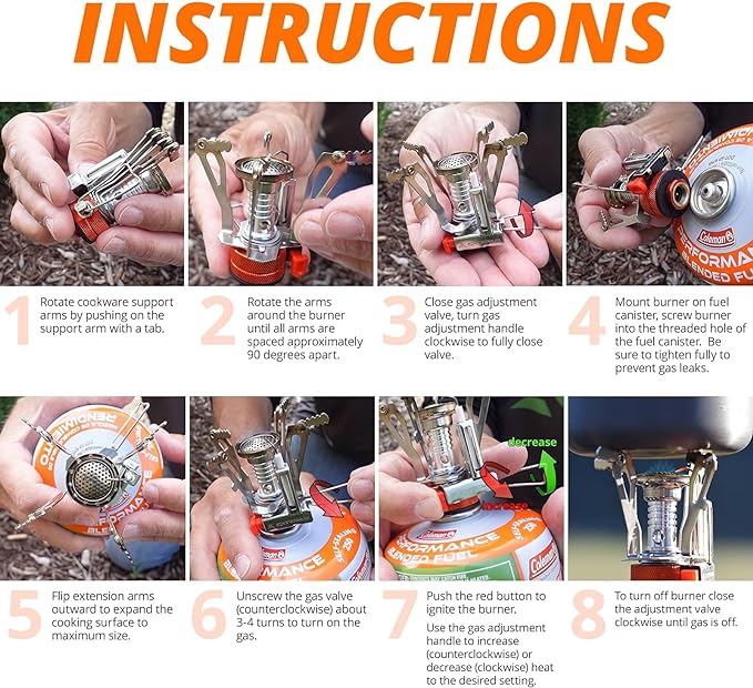 - EASY TO USE – The cooking surface expands to support up to an 8” diameter cooking pot. Burner is designed for optimal air flow to efficiently create heat for cooking. It can easily be adjusted from simmer to a full boil by turning the fuel valve.