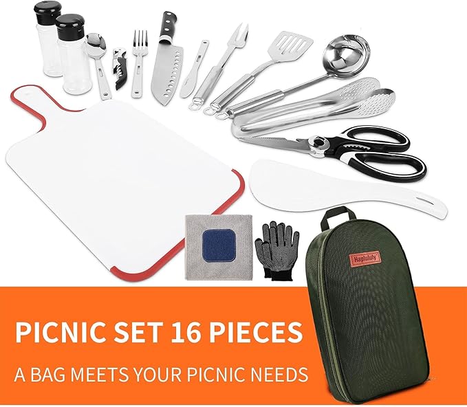 - 【widely used】 16 tools camping and cooking tools kit, cost-effective, designed for each family or outdoor enthusiast. This is a complete camping and kitchen tools kit to meet all your needs, for camping, parks, traveling, motorhome, backyard BBQ and party