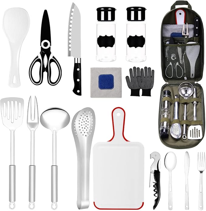 - 【What you will get】 Everyone has their unique use for the tools, and this kit will become your good partner for cooking. Including 1* Storage Bag, 1* Chopping Board, 1* Barbecue Fork, 1* Bottle Opener, 1* Non-Slip Gloves, 1* Cleaning Towel, 1* Frying Spatula, 1* Bread Clip, 1* Chef Knife, Tableware Knife/Fork /Spoon (3 Pieces) All Purchases Are Guaranteed. If You Have Any Questions About Our Products, Please Feel Free To Contact Us, We Will Try Our Best To Satisfy You.