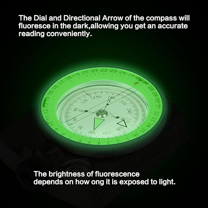 - FLUORESCENT DESIGN:The compass’ interface glows in the dark,you can find the right direction even at night without getting lost.