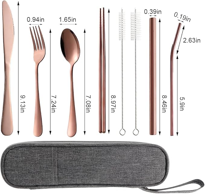 - The travel utensils incluede dinner knife, fork, spoon, chopsticks, Curved straw,Boba straw,cleaning brush ,carrying bag.