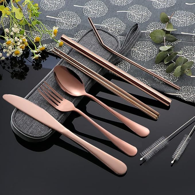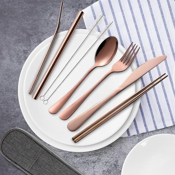 Portable Utensils Set,Reusable Travel Cutlery Set with Case Stainless Steel Flatware Set for Camping 8pcs Including Dinner Knife Fork Spoon Chopsticks Boba Straw (Rose gold)