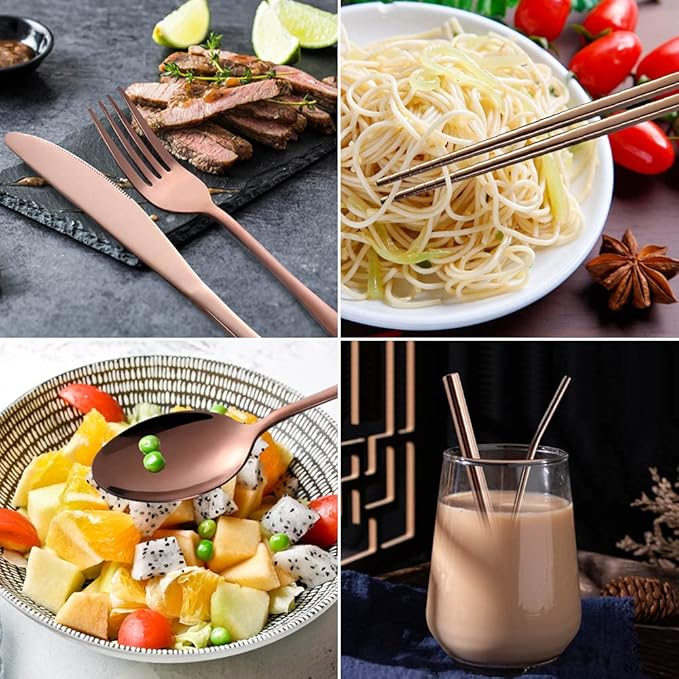 - Included Components : Dinner knife, Fork, Spoon, Chopsticks, Curved straw, Boba straw, Cleaning brush, Carrying bag