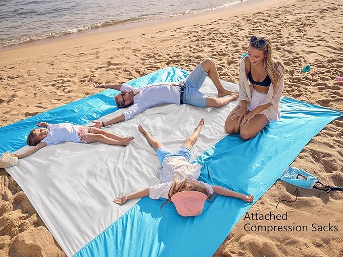 - ✔ OVERSIZED AND COMPACT-10'x9'(300cmX280cm) over 30% bigger than competing beach / picnic blanket, will comfortably fit 7 person, only weights 14 oz. Come with 6 metal stakes in a pouch for 4 anchor loops so you will have 2 spare ones just in case.