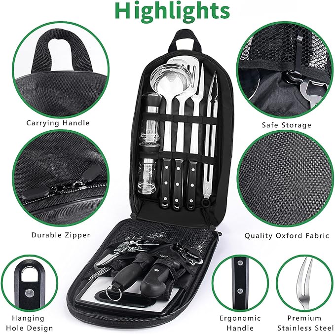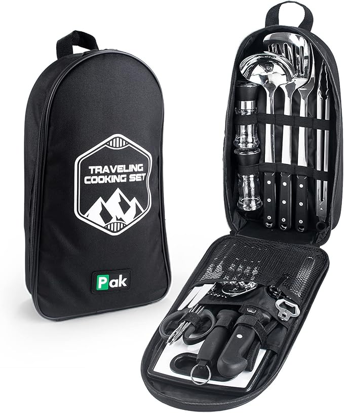 - ALL-IN-ONE - Camping utensils cooking set. This is a deluxe camping tool set, to fit every portable kitchen need. Perfect outdoor cooking equipment to go along with your camping items. Camping kitchen organizer to go with your travel cooking set!