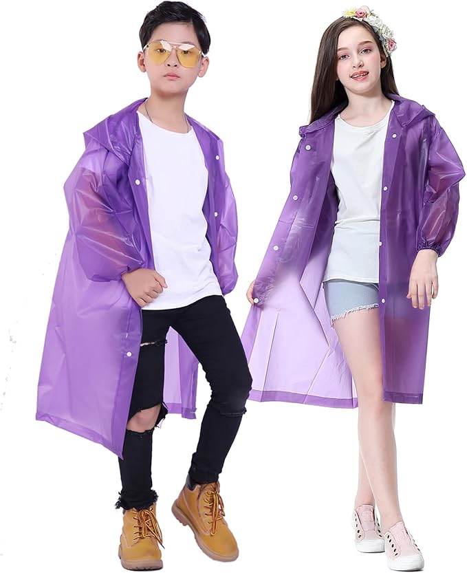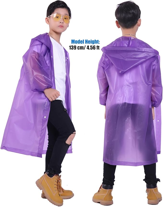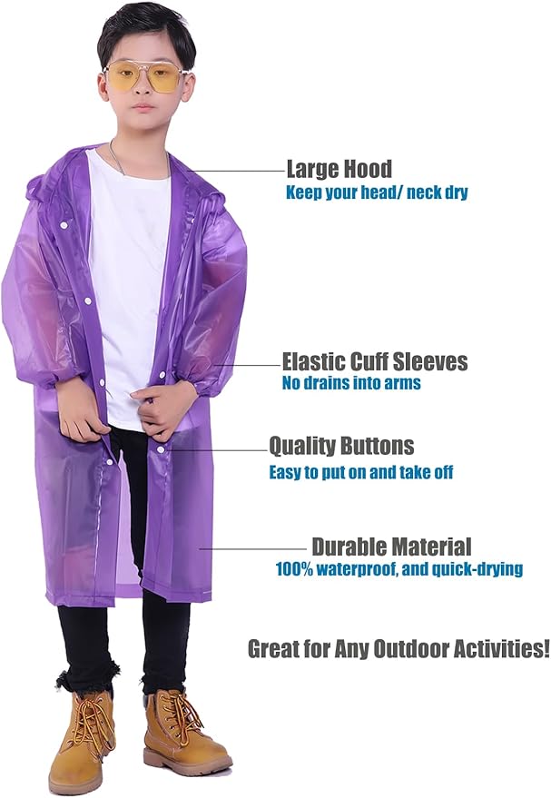 - Compact Emergency Protection: Our raincoat for girls and boys features a large hood, long sleeves, elastic cuffs, and snap buttons to keep you cool and dry in heavy rain. Easy to put on or take off, and fold for reuse. It saves space and reducing waste