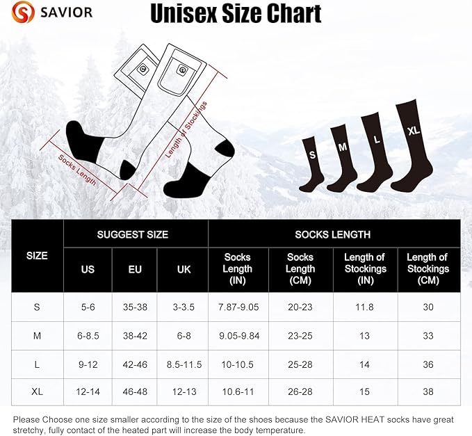 - 【Various Size Option】Savior Heated socks are design for all Men, Women, Male, Female, Boys, Girls and Elders to keep your feet warm. unlike other brands' designs with One size fit all heated socks, We provide S, M, L, XL size options, you can choose your snug-fit heated ski socks according to the size chart shown in the picture