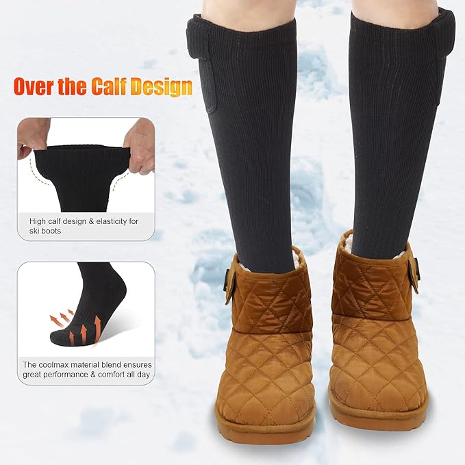 - 【Suitable for Winter Outdoors】Over the calf heated warmer socks are friendly with your ski boots; Coolmax, elastic, and Spandex material provides premium insulation performance while being midweight thickness and soft; the battery heated long socks are perfect for hunting, camping, skiing, skating, snowboarding, fishing, hiking, walking dogs, motorcycle, riding, office or outdoor working, etc.