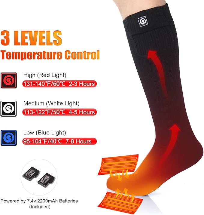 - 【Warm Your whole feet in Seconds】Electric breathable heated socks can stimulate poor blood circulation, keeping your feet warm & toasty in seconds; the Advanced Technology of Far-infrared Fiber Heating Elements Covers Instep and Toes Area; 3 Levels Intelligent Temperature Control make it easy and safe to adjust your perfect heat. High: 99% power (140F/60C 2-3hours ), Medium: 66% power (113F/50C 4-5 hours), Low: 33%power (95F/40C 8-9 hours)