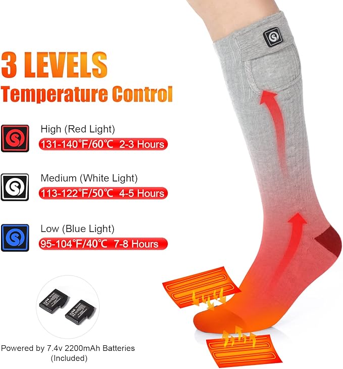- 【Warm Your whole feet in Seconds】Electric breathable heated socks can stimulate poor blood circulation, keeping your feet warm & toasty in seconds; the Advanced Technology of Far-infrared Fiber Heating Elements Covers Instep and Toes Area; 3 Levels Intelligent Temperature Control make it easy and safe to adjust your perfect heat. High: 99% power (140F/60C 2-3hours ), Medium: 66% power (113F/50C 4-5hours), Low: 33%power (95F/40C 8-9 hours)