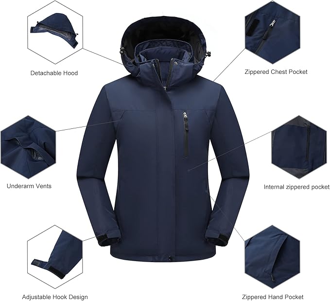 • Windproof & Waterproof - The shell jacket women is made with anti-water, grease, and 100% 75D*150D polyester fabric with 10000mmH2O waterproof index. This windproof waterproof designs of this womens 3 in 1 ski jacket features with a detachable hood, adjustable drawstring, elastic cuffs, and YKK zippers. It's worth noting that the womens jacket Will effectively seals warmth while keeping you security from ice cold gusts of wind.