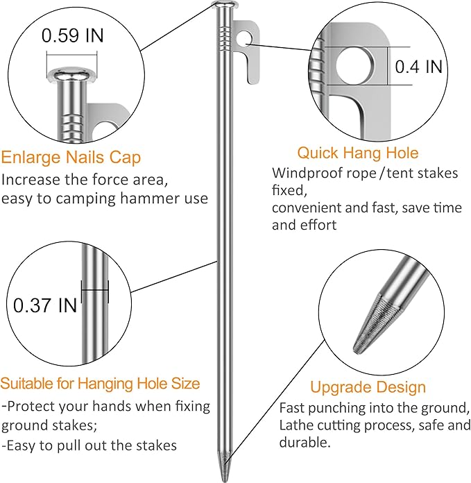 - 【Strong Holding Power】The large head and sharp end of the nail make it easy to penetrate hard or rocky ground, in case of hurt yourself when use them