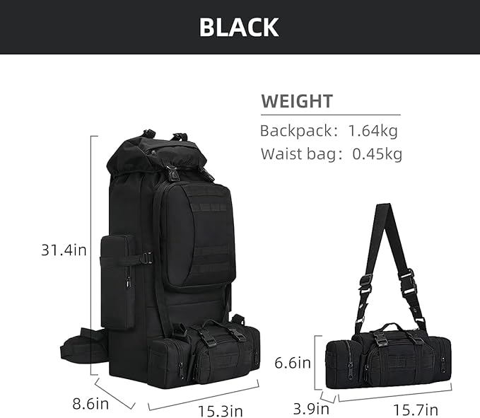 - Backpacking Backpack and Waist Bag Size - The backpacking backpack 100l size is 15.35 inch x 8.66 inch x 31.49 inch (L x W x H).military hiking backpack weighs 3.63 Ibs / 1.64 kg,carrying waist bag size 15.74 inch x 3.93 inch x 6.69 inch (L x W xH) waist bag only weighs 0.99 lbs/0.45 kg.100L hiking bag is suitable for camping, hiking, climbing, outdoor , traveling.