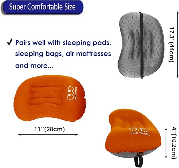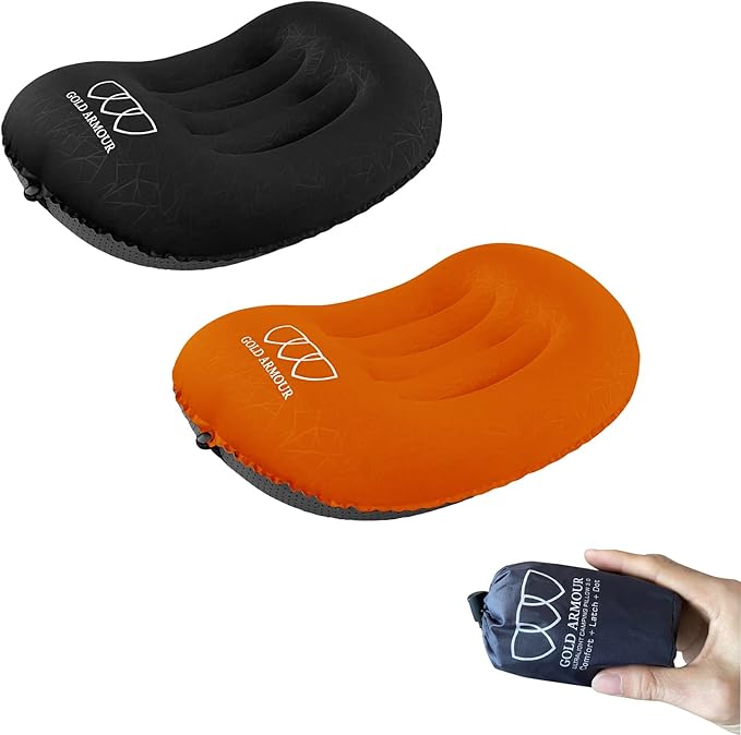 Gold Armour Inflatable Camping Pillow Backpacking Pillow Lightweight Travel Air Pillow Ultralight Ergonomic Pillow Portable for Airplanes with Neck & Lumbar Support (2 Pack) (Black & Orange)