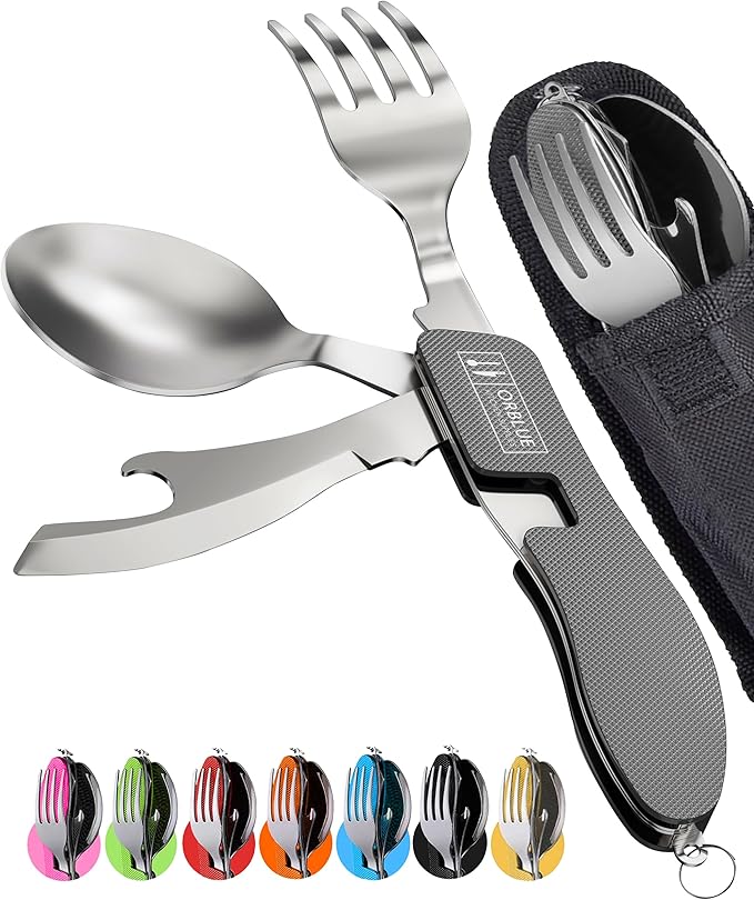 - 🍴 DINNER ESSENTIALS IN YOUR POCKET - Make eating out in the wild simple. This camping flatware tool lets you easily scoop, cut, and spear your meals. Plus, it fits perfectly in your pack or pocket.