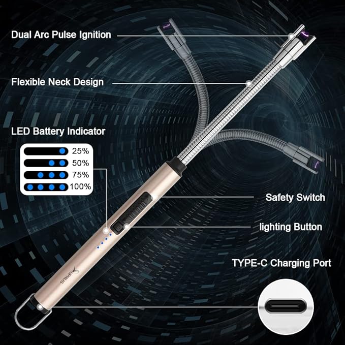 SUPRUS Electric Lighter Candle Lighter USB Type C Rechargeable Lighter Steel Shell & Hanging Hook with 360° Flexible Neck(Gold)