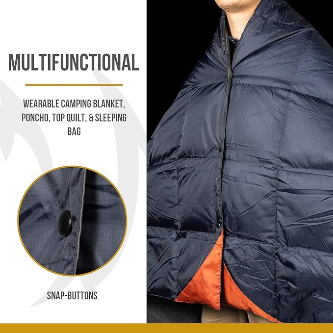 - Versatile Outdoor Blanket: This outdoor blanket can be used as a blanket, top-quilt, poncho, and cloak to keep you warm in all types of weathers. Use it as a blanket or a top-quilt for tents and hammocks;Snap buttons can be clasped shut for use as a poncho or cloak. Suitable for camping, hiking, backpacking, and also indoor use.