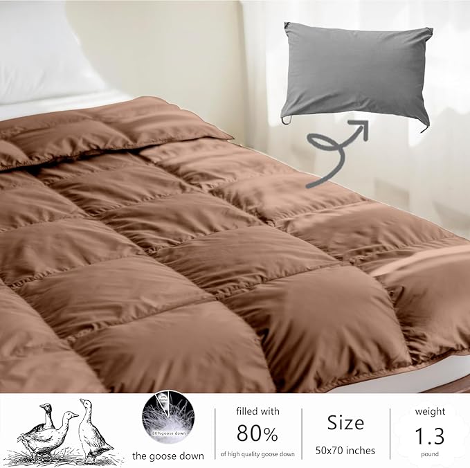 Soft Down Blanket Fluffy Lightweight Warm, Compact Portable Travel Throw Camping Blanket & Pillow Cushion, Airplane Train Beach Glamping Indoor Outdoor, 800 Fill Power 50x70’’ Brown
